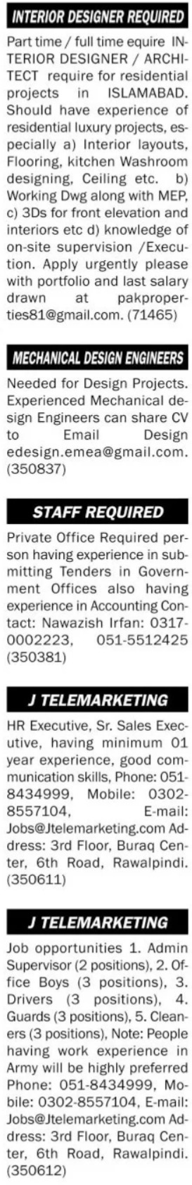 Private Company Islamabad, islamabad Islamabad Pakistan invites applications from eligible candidates for the post of architect, guard, office boy, mechanical design engineer, hr executive, interior designer, engineer, admin supervisor, driver and sales executive as per advertisement of March 14, 2022 published in daily The News Newspaper. Educational qualifications required Middle, Matric, Intermediate and Bachelor etc.