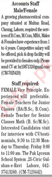 Private Company jobs advertisement dated about 14 November 2022 in daily The News Newspaper invites application for the vacant post of accounts staff, female teacher, teacher, accountant and vice principal in Lahore, lahore Punjab Pakistan. Candidates with Matric, Intermediate, Bachelor and Middle etc. educational background will be preferred.