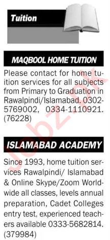 Academy Islamabad, rawalpindi Islamabad Pakistan invites applications from eligible candidates for the post of teacher, home tutor and primary teacher as per advertisement of January 15, 2024 published in daily The News Newspaper. Educational qualifications required MA, M.sc, Master and Bachelor etc.