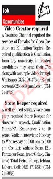 Private Company Lahore, lahore Punjab Pakistan invites applications from eligible candidates for the post of store keeper and video creator as per advertisement of January 15, 2024 published in daily The News Newspaper. Preferred Education is BA, Bachelor and Intermediate etc.