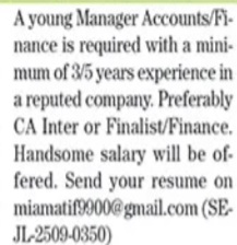 Latest Classifieds jobs in Accountancy Firm in Finance and others can be applied till 30 September 2025 or as per closing date in newspaper ad. Read complete ad online to know how to apply on latest Accountancy Firm job opportunities.