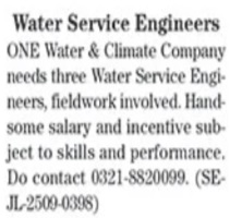 A Water Company jobs advertisement dated about 15 September 2025 in daily The News Newspaper invites application for the vacant post of engineer and water service engineer in Lahore, lahore Punjab Pakistan. Educational qualifications required Bachelor, DAE and Intermediate etc.