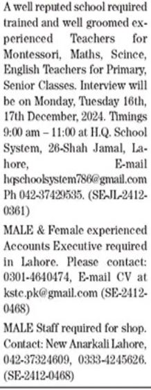 Vacant posts including teacher, english teacher, montessori teacher, science teacher, maths teacher, male staff, accounts executive and primary teacher are announced in Private Company Lahore, lahore Punjab Pakistan as per 16 December 2024 advertisement in daily The News Newspaper. Intermediate, Bachelor, Matric, B.com, BBA and M.sc etc. educational qualification will be preferred.