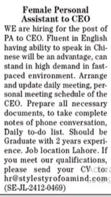 Style Styrofoamind Pvt Limited Lahore, lahore Punjab Pakistan invites applications from eligible candidates for the post of personal assistant and pa as per advertisement of December 16, 2024 published in daily The News Newspaper. BA and Bachelor etc. educational qualification will be preferred.