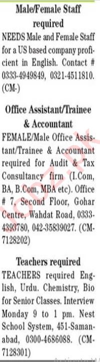 Vacant posts including office staff, female office staff, biology teacher, english teacher, accountant, office assistant, urdu teacher, trainee, teacher and chemistry teacher are announced in Private Company Lahore, lahore Punjab Pakistan as per 16 January 2023 advertisement in daily The News Newspaper. Educational qualifications required Bachelor, Master, Intermediate and Matric etc.