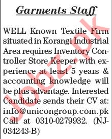 Latest Garments Factory Textile Posts Karachi 2025