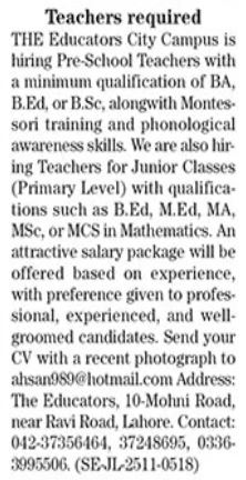 The Educators Ravi Road Lahore, lahore Punjab Pakistan invites applications from eligible candidates for the post of pre school teacher, mathematics teacher and teacher as per advertisement of November 17, 2025 published in daily The News Newspaper. B.ed, BA, Others and Bachelor etc. educational qualification will be preferred.