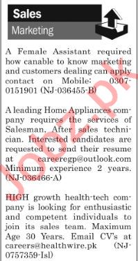 Vacancies in Marketing Company Advertisement December 2018