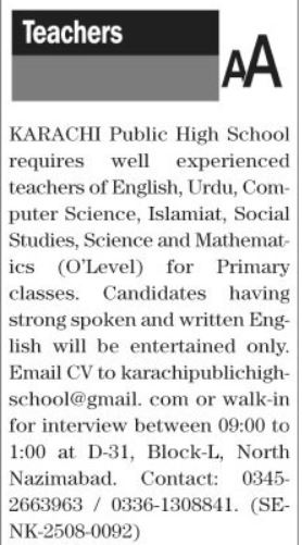 Vacant posts including o level teacher, islamiat teacher, teacher, computer science teacher, urdu teacher, lady teacher, mathematics teacher, social studies teacher, english teacher and science teacher are announced in Karachi Public School KPS North Nazimabad - Block L Karachi, karachi Sindh Pakistan as per 18 August 2025 advertisement in daily The News Newspaper. Educational qualifications required M.sc, MA, BA, Bachelor, Others and Master etc.