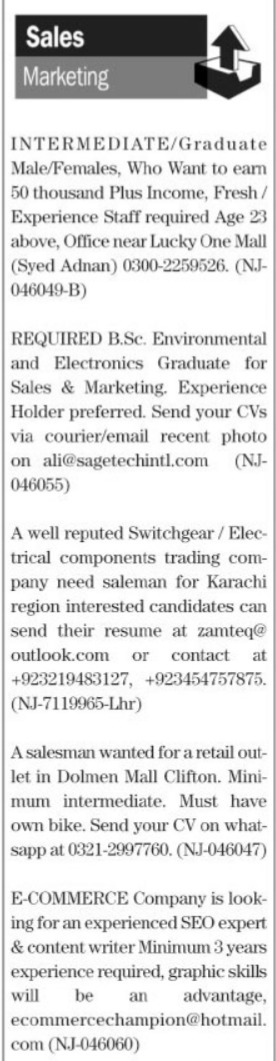 Vacant posts including sales officer, content writer, sales staff, seo, salesman, seo expert and marketing officer are announced in Marketing Company Karachi, karachi Sindh Pakistan as per 18 July 2022 advertisement in daily The News Newspaper. Persons with Intermediate, Matric and Bachelor etc. education can apply.