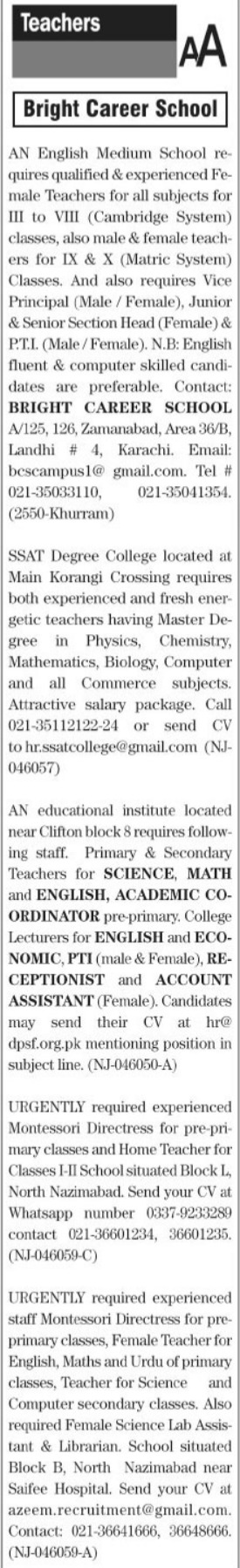 Private School Karachi, karachi Sindh Pakistan invites applications from eligible candidates for the post of primary class teacher, academic coordinator, urdu teacher, computer teacher, math teacher, chemistry teacher, economics teacher, pti, mathematics teacher, english teacher, vice principal, section head, subject teacher, receptionist, montessori directress, principal, librarian, female teacher, home teacher, physics teacher, account assistant, science teacher, lab assistant, primary teacher, teacher and biology teacher as per advertisement of July 18, 2022 published in daily The News Newspaper. Persons with Intermediate, Master and Bachelor etc. education can apply.