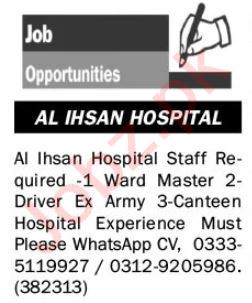 Al Ihsan Hospital latest Classifieds Medical jobs and others can be applied till 28 April 2024 or as per closing date in newspaper ad. Read complete ad online to know how to apply on latest Al Ihsan Hospital job opportunities. Learn today skills like Health, Driving and Medical to apply confidently on these Al Ihsan Hospital jobs.