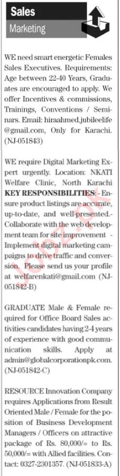 Marketing Company Karachi, karachi Sindh Pakistan invites applications from eligible candidates for the post of marketing executive, sales executive, sales officer and digital marketing expert as per advertisement of March 18, 2024 published in daily The News Newspaper. Candidates with Intermediate, BA, BBA, Matric, B.com and Bachelor etc. educational background will be preferred.
