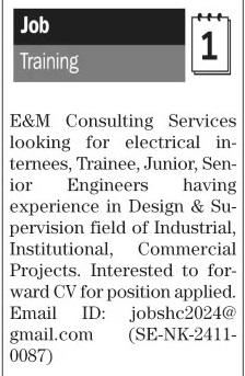 International Consulting Services jobs advertisement dated about 18 November 2024 in daily The News Newspaper invites application for the vacant post of electrical internee, engineer and trainee in Karachi, karachi Sindh Pakistan. Preferred Education is DAE, Intermediate and Bachelor etc.