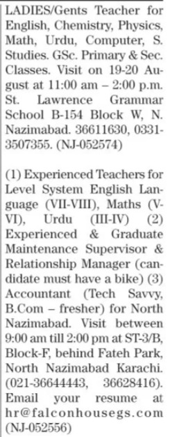 Private School Karachi, karachi Sindh Pakistan invites applications from eligible candidates for the post of general science teacher, accountant, social studies teacher, computer teacher, teacher, lady teacher, chemistry teacher, relationship manager, maintenance supervisor, math teacher, urdu teacher, english teacher, primary teacher and physics teacher as per advertisement of August 19, 2024 published in daily The News Newspaper. BA, B.com, M.sc, Master, Bachelor and MA etc. educational qualification will be preferred.