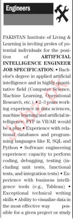 Vacant posts including artificial intelligence engineer and engineer are announced in Pakistan Institute of Living And Learning PILL Karachi, karachi Sindh Pakistan as per 19 December 2022 advertisement in daily The News Newspaper. Bachelor etc. educational qualification will be preferred.