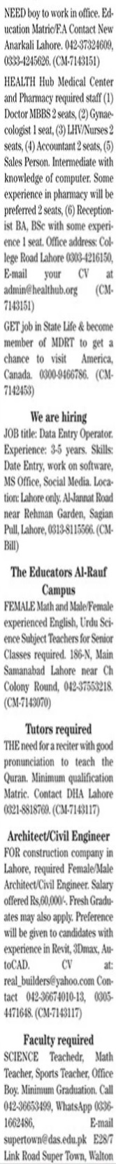 Vacant posts including urdu teacher, data entry operator, english teacher, tutor, sales person, receptionist, office boy, architect, quran teacher, mbbs doctor, lhv, gynecologist, math teacher, sports teacher, doctor, civil engineer, accountant, insurance agent, science teacher, home tutor and nurse are announced in Private Company Lahore, lahore Punjab Pakistan as per 19 February 2024 advertisement in daily The News Newspaper. Educational qualifications required B.com, MA, BA, BBA, M.sc, Bachelor, B.E, Intermediate, Matric and Middle etc.