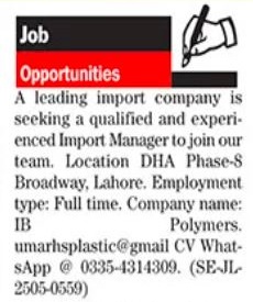 Export Import Company invites applications for job positions advertised in daily The News dated 19 May 2025 for following vacancies in DHA Phase 8 Lahore, lahore Punjab Pakistan.