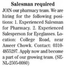 Pharmacy Store invites applications for job positions advertised in daily The News dated 19 May 2025 for following vacancies in College Road Lahore, lahore Punjab Pakistan.