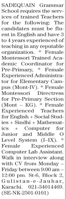 Sadequain Grammar School jobs advertisement dated about 20 January 2025 in daily The News Newspaper invites application for the vacant post of kg teacher, sindhi teacher, academic coordinator, computer teacher, mathematics teacher, lady teacher, teacher, administrator, social studies teacher, pre primary teacher, english teacher, montessori directress and montessori trained teacher in Karachi, karachi Sindh Pakistan. Persons with Master, M.sc, Bachelor, B.ed, MS, BA and MA etc. education can apply.