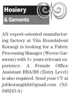 Latest Classifieds jobs in Garments Factory in Textile and others can be applied till 16 July 2022 or as per closing date in newspaper ad. Read complete ad online to know how to apply on latest Garments Factory job opportunities.