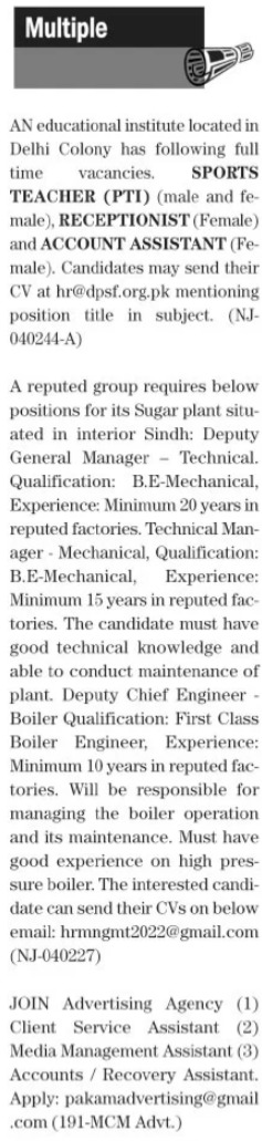 Private Company Karachi, karachi Sindh Pakistan invites applications from eligible candidates for the post of pti, assistant, deputy chief engineer, media management assistant, recovery assistant, engineer, deputy general manager, client service assistant, boiler engineer, mechanical engineer, sport teacher, account assistant and receptionist as per advertisement of June 20, 2022 published in daily The News Newspaper. Preferred Education is Matric, Intermediate, Bachelor and Middle etc.