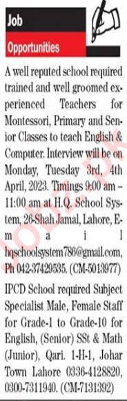 Private School Lahore, lahore Punjab Pakistan invites applications from eligible candidates for the post of secondary class teacher, montessori teacher, computer teacher, female teacher, english teacher, teacher, subject specialist and primary teacher as per advertisement of April 3, 2023 published in daily The News Newspaper. Preferred Education is Bachelor, Master and Intermediate etc.