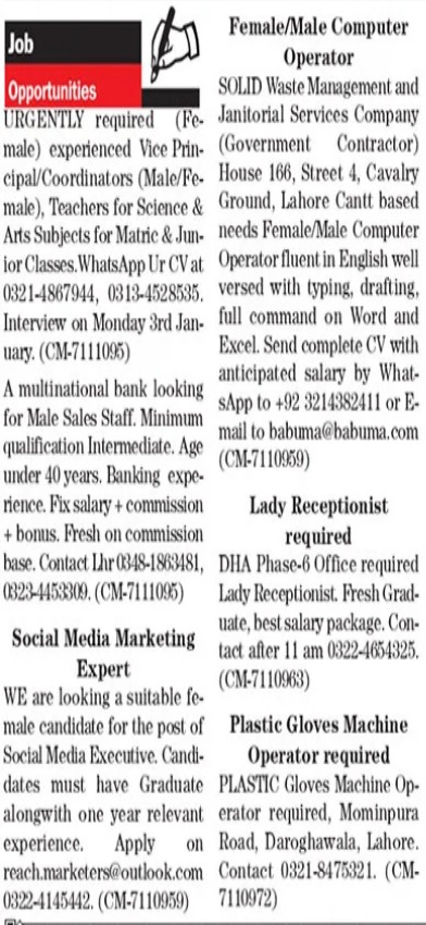 Vice Principal, Coordinator, Sweeper, Teacher, Lady Receptionist, Assistant Supervisor, Outdoor Delivery Staff, Security Guard, Driver, Generator Operator, Site Supervisor, Lady Telephone Operator, Diesel Engine Mechanic, Customer Service Manager seeks in well reputed companies.