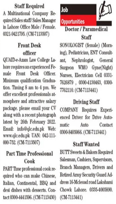 Vacant posts including security guard, cook, nephrologist, lady sonologist, driver ltv, technician, woman medical officer, cash supervisor, sales staff, front desk officer, driving staff, driver, salesman, wmo, cashier, branch manager, ent consultant, sales manager, chef, general surgeon and pediatrician are announced in Private Company Lahore, lahore Punjab Pakistan as per 20 February 2022 advertisement in daily The News Newspaper. Persons with Middle, Bachelor, MBBS, Matric, Intermediate and Others etc. education can apply.