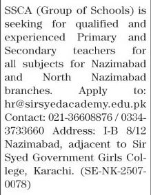 Vacant posts including secondary teacher, teacher and primary teacher are announced in Sir Syed Children Academy SSCA North Nazimabad Karachi, karachi Sindh Pakistan as per 21 July 2025 advertisement in daily The News Newspaper. Master, Bachelor, MA, Others and M.sc etc. educational qualification will be preferred.