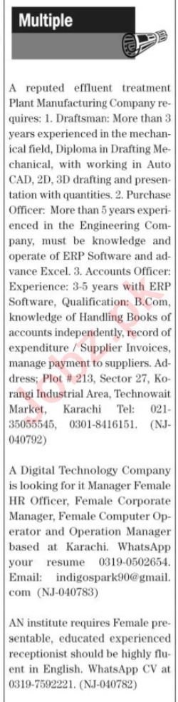 Private Company jobs advertisement dated about 21 November 2022 in daily The News Newspaper invites application for the vacant post of draftsman, autocad operator, corporate manager, operation manager, purchase officer, computer operator, hr officer and accounts officer in Karachi, karachi Sindh Pakistan. Educational qualifications required Matric, Bachelor, Intermediate and Middle etc.