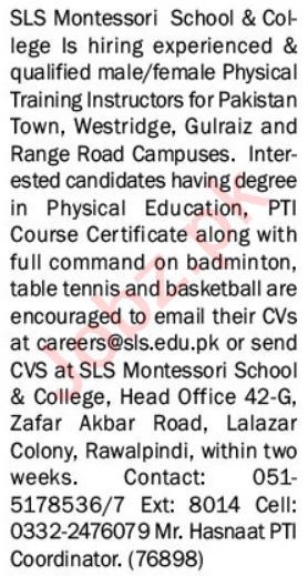 SLS Montessori School and College invites applications for job positions advertised in daily The News dated 22 April 2024 for following vacancies in Rawalpindi, rawalpindi Punjab Pakistan.