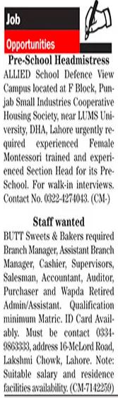 Private Company jobs advertisement dated about 22 January 2024 in daily The News Newspaper invites application for the vacant post of assistant, preschool headmistress, accountant, auditor, supervisor, cashier, admin assistant, branch manager, salesman, purchaser and assistant branch manager in Lahore, lahore Punjab Pakistan. Bachelor, BA, B.com, MA, M.sc, Matric and Intermediate etc. educational qualification will be preferred.