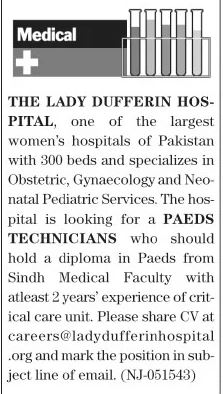 Lady Dufferin Hospital is looking for candidates for following posts as per job advertisement published in daily The News Newspaper of January 22, 2024 for location Karachi, karachi Sindh Pakistan: