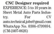Factory Lahore, lahore Punjab Pakistan invites applications from eligible candidates for the post of cnc designer as per advertisement of July 22, 2024 published in daily The News Newspaper. Preferred Education is Matric, Intermediate and DAE etc.