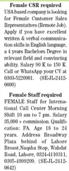 Latest Customer Service jobs and others Classifieds jobs in Private Company closing date is around January 7, 2025, see exact from ad. Read complete ad online to know how to apply on latest Private Company job opportunities.