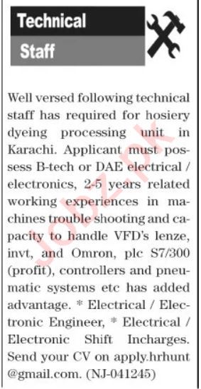 Private Industry jobs advertisement dated about 23 January 2023 in daily The News Newspaper invites application for the vacant post of electronics technician, electrical technician, electrical engineer, shift incharge, electronic engineer and technical staff in Karachi, karachi Sindh Pakistan. Candidates with Intermediate, Matric and Bachelor etc. educational background will be preferred.