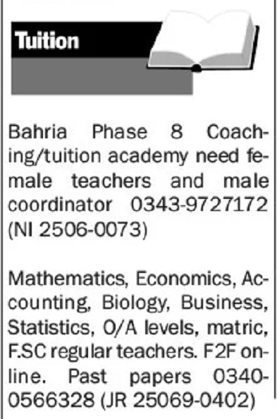 Academy jobs advertisement dated about 23 June 2025 in daily The News Newspaper invites application for the vacant post of home tutor, o level teacher, tutor, economics teacher, teacher, accounting teacher, biology teacher, mathematics teacher and a level teacher in Bahria Town Islamabad, islamabad Islamabad Pakistan. Educational qualifications required Bachelor and Master etc.