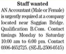 Accountancy Firm jobs advertisement dated about 23 June 2025 in daily The News Newspaper invites application for the vacant post of accountant and female accountant in Sagiyan Bridge Lahore, lahore Punjab Pakistan. Preferred Education is Bachelor and B.com etc.