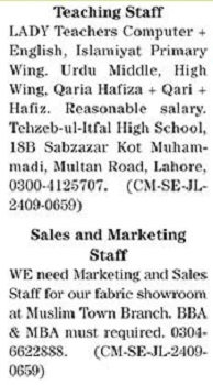 Private Company jobs advertisement dated about 23 September 2024 in daily The News Newspaper invites application for the vacant post of urdu teacher, hafiz, computer teacher, hafiza, marketing staff, teacher, qari, qaria, sales staff and lady teacher in Lahore, lahore Punjab Pakistan. Preferred Education is BA, BBA and Intermediate etc.