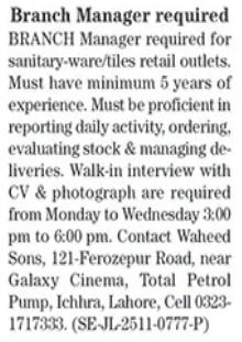 Waheed Sons Lahore, lahore Punjab Pakistan invites applications from eligible candidates for the post of manager and branch manager as per advertisement of November 24, 2025 published in daily The News Newspaper. Candidates with Bachelor, Others and BA etc. educational background will be preferred.
