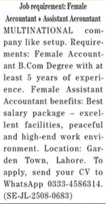 Multinational Company Garden Town Lahore, lahore Punjab Pakistan invites applications from eligible candidates for the post of accountant and assistant accountant as per advertisement of August 25, 2025 published in daily The News Newspaper. Candidates with Bachelor, B.com and Others etc. educational background will be preferred.