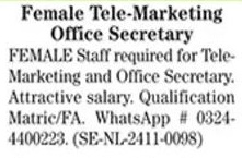 Private Company Lahore, lahore Punjab Pakistan invites applications from eligible candidates for the post of office secretary and telemarketing officer as per advertisement of November 25, 2024 published in daily The News Newspaper. Persons with Intermediate and Matric etc. education can apply.