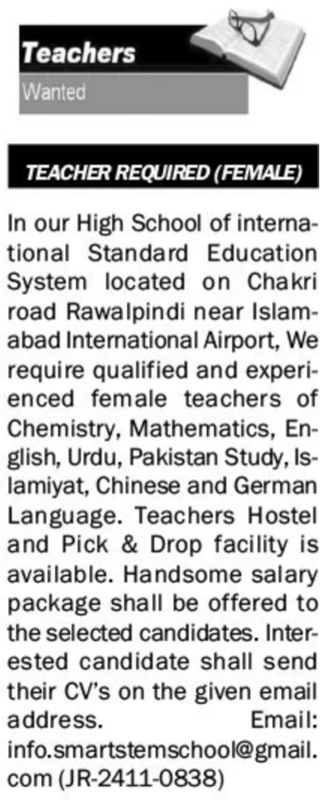 Smart Stem School Rawalpindi, islamabad Punjab Pakistan invites applications from eligible candidates for the post of mathematics teacher, english teacher, teacher, female teacher, chemistry teacher, german language teacher, urdu teacher, chinese language teacher, islamiyat teacher and pakistan study teacher as per advertisement of November 25, 2024 published in daily The News Newspaper. Preferred Education is BA, M.sc, Master, MA and Bachelor etc.