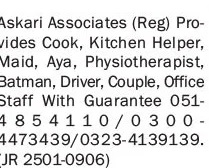Askari Associates Pvt Ltd jobs advertisement dated about 27 January 2025 in daily The News Newspaper invites application for the vacant post of aya, cook, kitchen helper, maid, physiotherapist, driver, husband wife, batman and office staff in Islamabad, islamabad Islamabad Pakistan. Persons with Primary, Intermediate, Middle and Matric etc. education can apply.