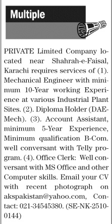 Private Company is looking for candidates for following posts as per job advertisement published in daily The News Newspaper of October 27, 2025 for location Shahrah-e-Faisal Karachi, karachi Sindh Pakistan: