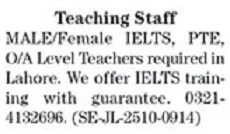 Private School Lahore, lahore Punjab Pakistan invites applications from eligible candidates for the post of o level teacher, teacher, ielts teacher and a level teacher as per advertisement of October 27, 2025 published in daily The News Newspaper. Candidates with Master and Bachelor etc. educational background will be preferred.