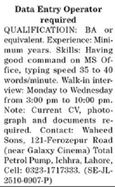 Waheed Sons invites applications for job positions advertised in daily The News dated 27 October 2025 for following vacancies in Ferozepur Road Lahore, lahore Punjab Pakistan.
