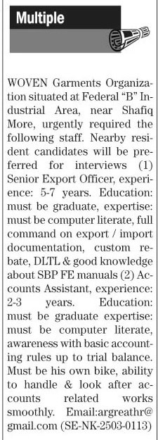 Garments Factory jobs advertisement dated about 28 April 2025 in daily The News Newspaper invites application for the vacant post of accounts assistant and export officer in Federal B Area Karachi, karachi Sindh Pakistan. Educational qualifications required Intermediate, Bachelor, BA, B.com and BBA etc.
