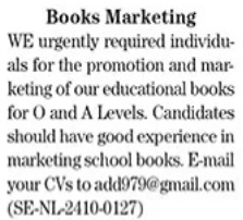 Marketing Company invites applications for job positions advertised in daily The News dated 28 October 2024 for following vacancies in Lahore, lahore Punjab Pakistan.